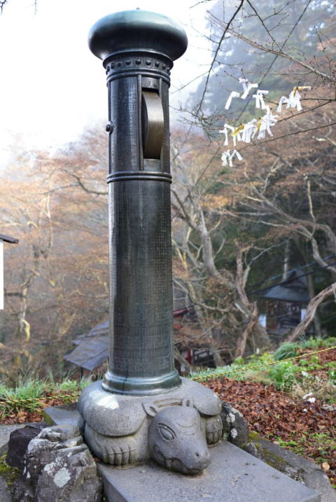 | 2019年12月10日撮影 おや,変わったものが? 横の説明書きによれば「供養車」だそうです. そして,下記の説明書きがありました. この車を廻せば悲痛な音を発し,これが冥土にとどいて白虎隊士の霊 魂を慰めるものです.また石の台は中国伝説の獏といい夢を喰うので ,その頭にのぼれば悪夢消滅の願いをかなえると言われています. |
