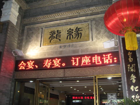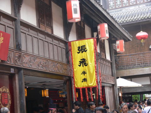 | 2011年5月2日撮影 三国志の豪傑「張飛」の名前で売っている店.張飛に扮した店員さん(上の写真に顔と頭が写っています)が記念写真に応じてくれます. |