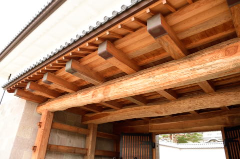 2016年12月26日撮影 立派な梁ですね. 「河北門」に関する説明文です. 金沢城三の丸の正門が河北門です.橋爪門,石川門とともに「三御門 」と呼ばれ,御殿に至る要所を固めていました.いずれも四角い広場を 内と外の門で厳重に固めた「枡形門(ますがたもん)」形式の城門です .中でも河北門は,大手筋の要所を防備する重要な門でした. 復元建物は,安永元年(1772)に再建され明治15年(1883)頃まで 存続していた河北門の姿を多数の資料の調査と検証に基づいて再現 したものです.(この表記の中で「明治15年(1883)」とありますが,和 暦か西暦のどちらかが違っていると思います.「明治15年」であれば 1882年となります) |