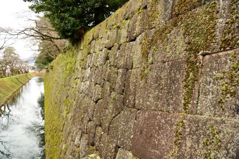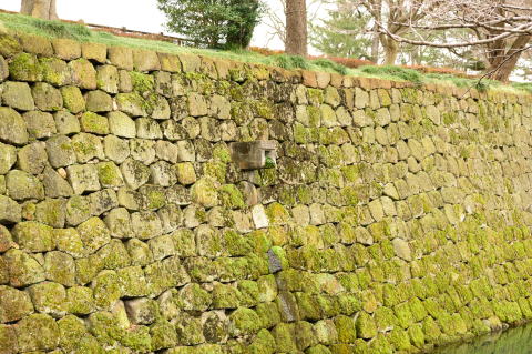 2016年12月26日撮影 あれっ!新しい石垣の積み方の名前が登場してしまいした. この石垣の所にある駒札には下記の記載がありました. 色紙短冊積(しきしたんざくづみ)石垣 色紙(方形)や短冊(縦長方形)状の石やV字形の石桶が組み込まれた ,金沢城内で最も意匠的な石垣です.石垣の下部を約2m埋め戻した ため,現在見ることはできませんが,発掘調査では滝壺の石組が発見 され,V字形の石桶から落水する落差9mに及ぶ石垣の滝だったことが 判明しています. |