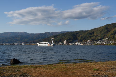 | 2015年10月29日 「下諏訪」から少し早めに戻ったので,ホテルの目の前の「諏訪湖」へ.空気が澄んで空が高いという気がしました. 諏訪盆地の真ん中に位置する「諏訪湖」は,海抜759m,湖周15.9km,面積13.3k㎡の信州一大きな湖です.かつては湖面の前面が氷結し,ワカサギ釣りも盛んでした.また,前面氷結した際に,氷の膨張と収縮のバランスによって大音響とともに湖面上に氷の亀裂が走り,せり上がる自然現象「御神渡り(おみわたり)」は有名ですが,最近では前面氷結することが少ないようです. |
