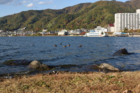 | 2015年10月29日 野鳥が「諏訪湖」の畔を餌を啄みながら歩いている,長閑な風景です. |