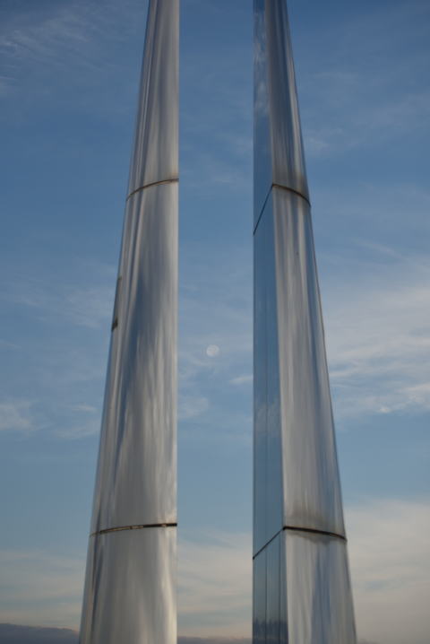| 2015年10月30日 湖畔のモニュメントの中央に朝方の月が見えます. |