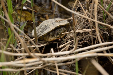 2016年4月11日撮影 写真左の「カメ(恐らくアカミミガメ)」のことが気になっており,ほぼ同 じ個所を時間を掛けて見てみると,再び見掛けることができました(恐 らく同じ「カメ」だと思います).この写真を撮った後,拡大して見ると 右前足が途中までしか無いようです.理由は想像することもできませ んが,“医者”もいない自然の中でしっかり生きています.「アカミミガ メ」であれば,“駆除対象生物”となり,可哀そうな運命ですが・・・これ 以上,何とも言いようがありません, |